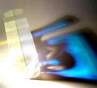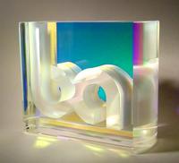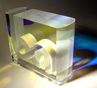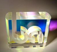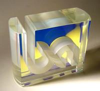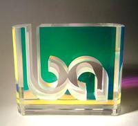 The Bentel Associated International award was made using optical quality glass with a sheet of dichroic glass "sandwiched" between via UV-bonding. The logo was created using water jet cutting.