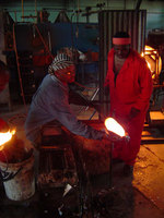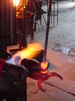 Whenever I had a chance I would go inside to dry and warm myself. As there were many artists working inside everybody was given a slot with a blower and his team to materialize their designs in glass. My sessions were later in the afternoon and I had some really thick and chunky work made. Unfortunately my choice of colour on the first piece caused it to crack. I tried to save it by cutting the cracks out but to no avail…