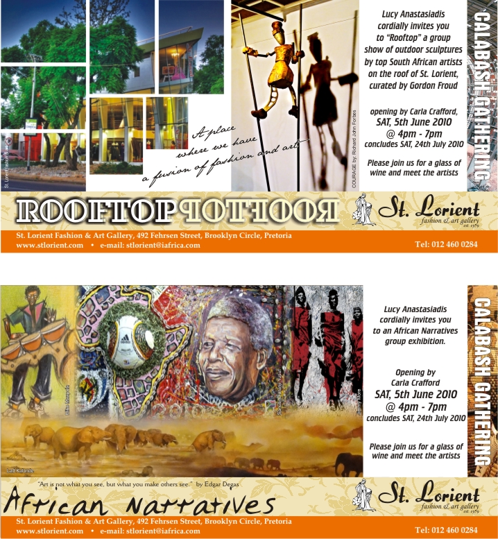We invite you to the "ROOFTOP" Exhibition Opening on Saturday 5th of June2010.It is a group show of outdoor sculptures by top South African Artists.