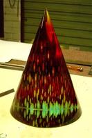 Yes, this is still the same piece. Various layers of thin glass were laminated to the back using coloured UV-glue. Isn’t it amazing how the glass absorbs the colour? The rough ground surface is then also cut on a sand stone wheel, smoothing the glass surface for polishing. (The glass is still wet on this image, giving the illusion of it being polished.)